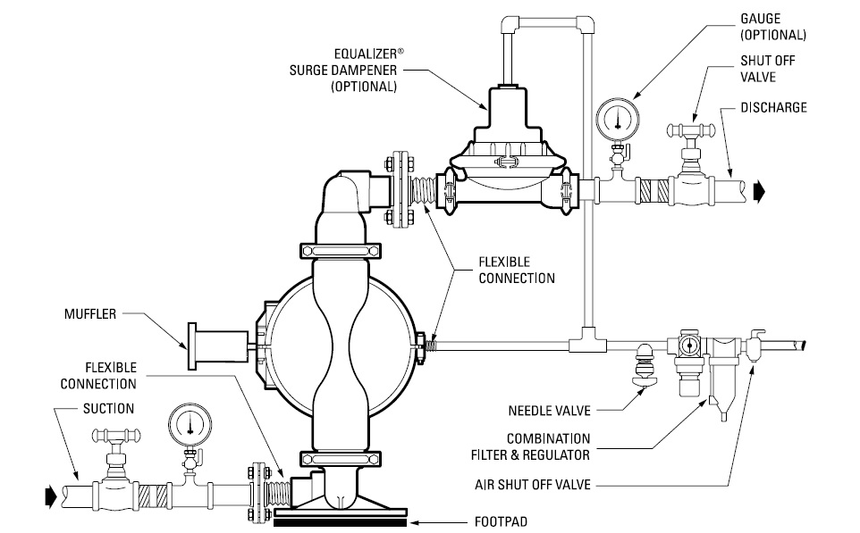Install the pump on a flat table, fix the foot, and connect the material inlet and outlet pipe (suggestion for material inlet and outlet: install 30-50cm long elastic hose (or flexible joint) to protect the pump, reduce and reduce vibration, avoid bolt loosening and leakage), tighten all screws on diaphragm pump (to prevent bolt loosening during transportation), and then connect air source.